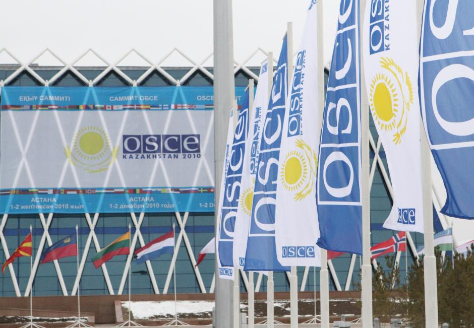 Des drapeaux aux couleurs de l'OSCE flottent à l'extérieur du Palais de l'indépendance, qui accueille le Sommet de l'OSCE 2010 à Astana, 26 novembre 2010.