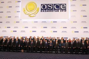 (de izq. a der.): El Secretario General de la OSCE, Marc Perrin de Brichambaut; el Presidente en Ejercicio de la OSCE, Kanat Saudabayev, Ministro de Asuntos Exteriores de Kazajstán; y el Presidente de Kazajstán, Nursultan Nazarbayev, en la sesión de clausura de la Cumbre de la OSCE en Astana, 2 de diciembre de 2010.