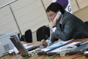 Un bureau d’information au Centre des médias, Astana, le 26 novembre 2010.