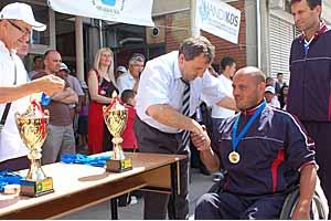 Ali Bajgora le directeur du Centre kosovar d'éducation et de développement en matière de sécurité publique (KCPSED) remet des médailles aux participants d’une mini olympiade pour jeunes handicapés organisée par la Mission, Vushtrri/Vucitrn, le 18 juin 2010.