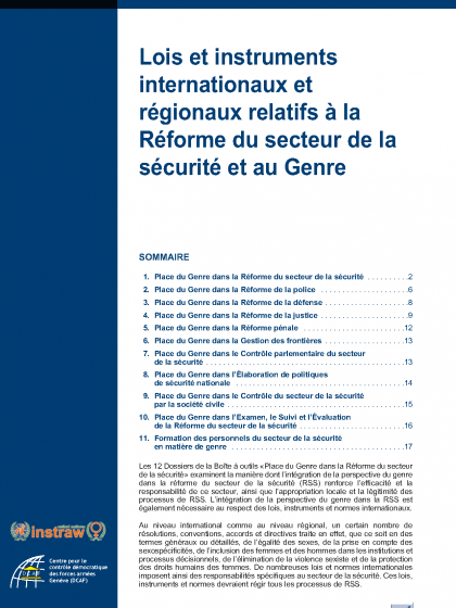 La suite de ce chapitre consiste en une compilation des lois et instruments principaux en matière de genre et de RSS, avec un référencement des articles spécifiques portant sur certaines institutions du secteur de la sécurité. Les lois et instruments mentionnés sont distingués en fonction de leur nature internationale ou régionale et classés par ordre chronologique.