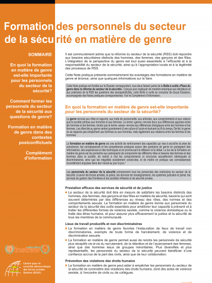 Ce Dossier entend servir de guide pratique pour la préparation, la mise en oeuvre et l’évaluation de la formation en matière de genre destinée aux personnels du secteur de la sécurité.