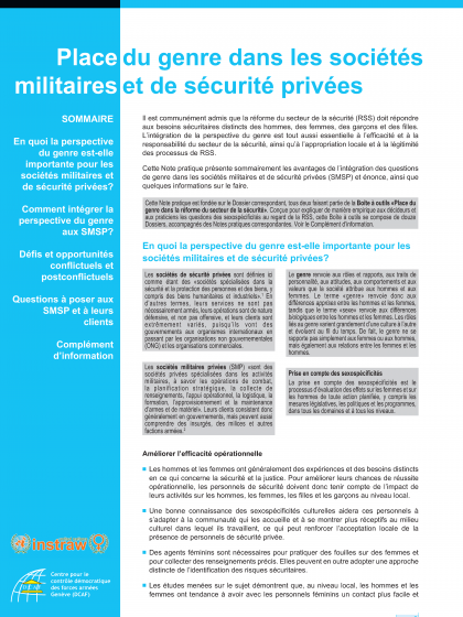 Cette Note pratique présente sommairement les avantages de l’intégration des questions de genre dans les sociétés militaires et de sécurité privées (SMSP) et énonce, ainsi que quelques informations sur le faire.