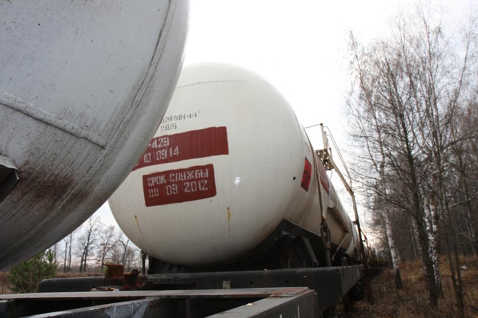 A specialized railway tank holding the toxic rocket fuel component melange sits in a military base in Kalynivka, Vinnytsya region, ahead of its departure to Russia, where it will be safely disposed of in an OSCE project. 18 November 2009.
