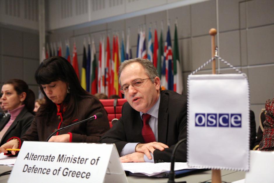 Greek Ambassador Mara Marinaki (left) listens as Greek Alternate Minister of National Defence, Panos Beglitis, addresses the Forum for Security Co-operation meeting in Vienna, 20 January 2010.