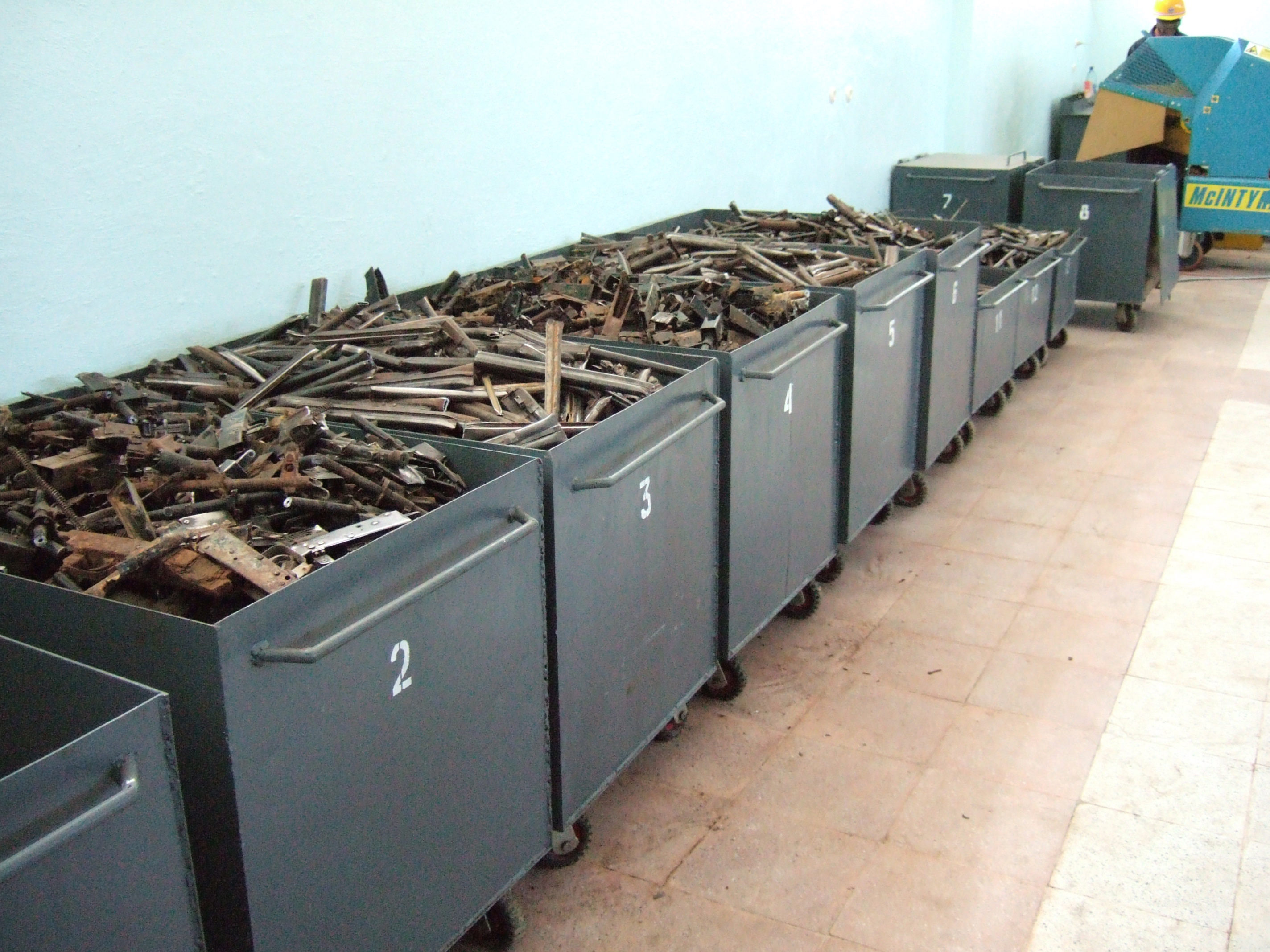 The OSCE is helping Tajikistan, secure and destroy large stockpiles of small arms and ammunition. Here, large containers illustrate the number of surplus weapons that are being rendered ineffective, 26 September 2006.