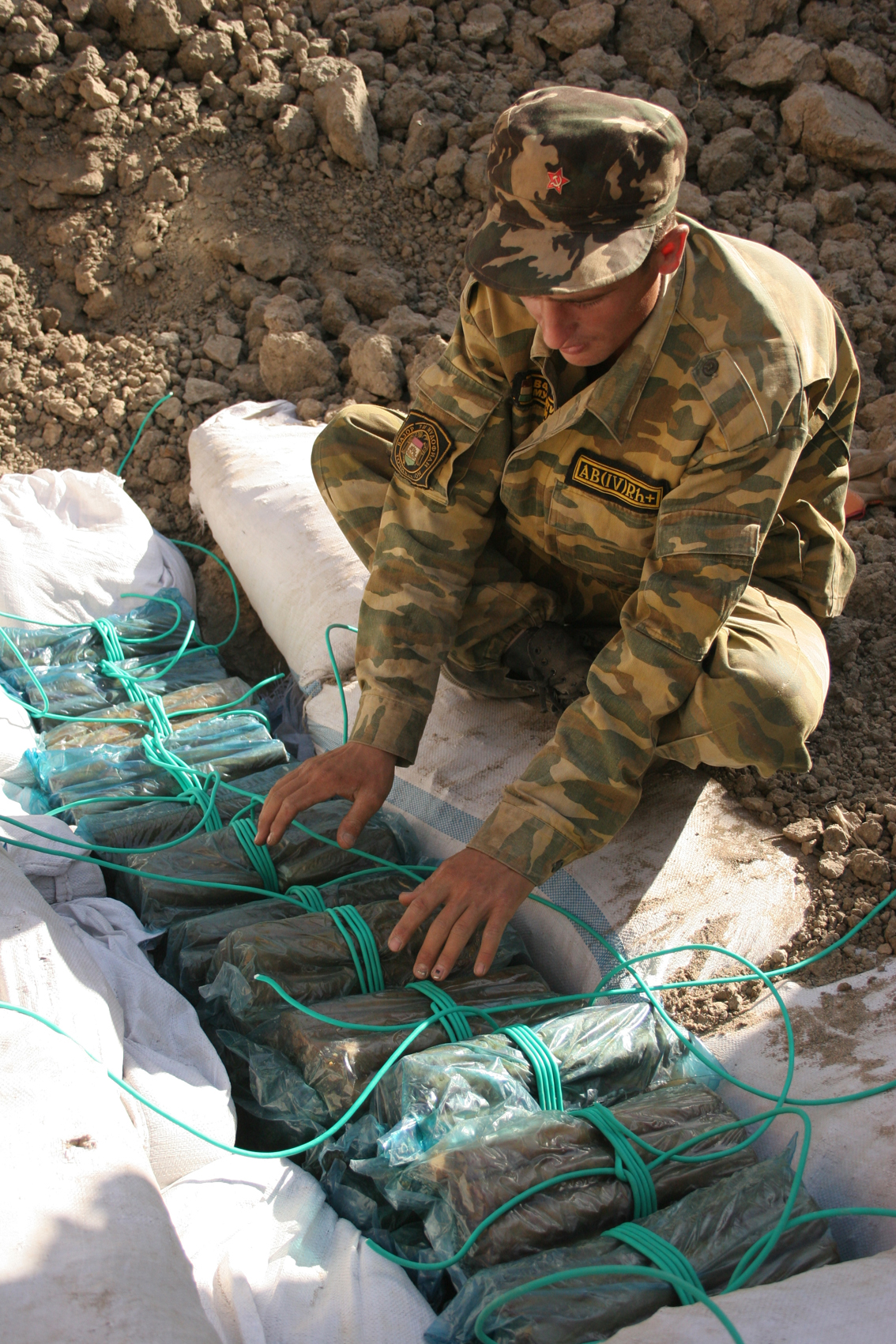A trained expert setting up to detonate a pile of shoulder-fired weapons known as MANPADS, or man-portable air defence systems, in Tajikistan, 21 June 2006.