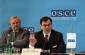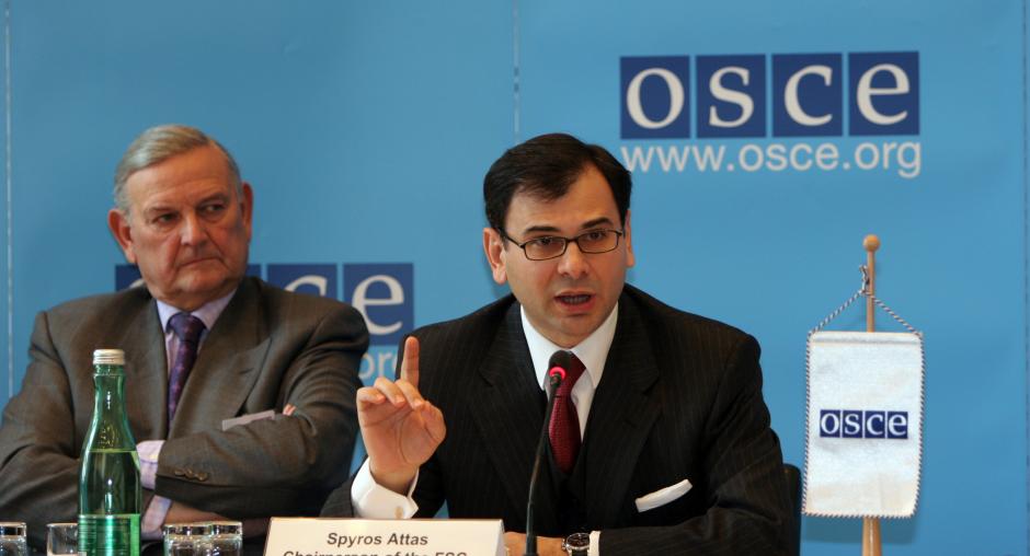 Cyprus FSC Chairman Spyros Attas (right) speaks at an OSCE news conference in Vienna, 21 March 2007. Francois-Xavier de Donnaa, Member of Belgian Parliament and former defence minister, looks on. (OSCE/Mikhail Evstafiev)