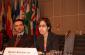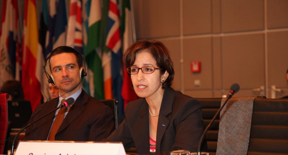 Politico-Military Counsellor Loic Simonet of France listens as the OSCE Senior Adviser on Gender Issues, Jamila Seftaoui, delivers a speech to the OSCE Forum for Security Co-operation. 1 April 2009, Vienna. (OSCE/Susanna Lööf)