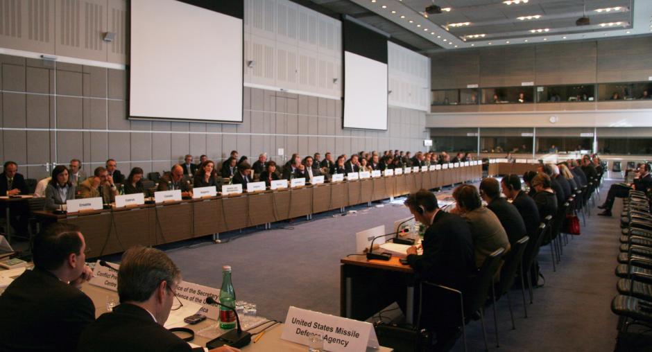 Delegations of the 56 OSCE participating States, including Russia and the United States, discuss the missile defence initiative at a meeting of the Forum for Security Co-operation, in Vienna, 31 October 2007. (OSCE/Mikhail Evstafiev)