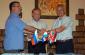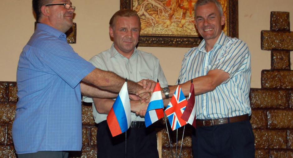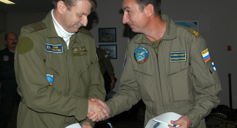 Shaking hands after a joint UK-Croatia flight over Russia, 17 August 2006, under the Open Skies Treaty. Latvian representatives observed the flights. (OSCE)