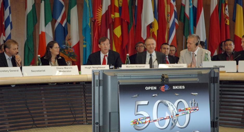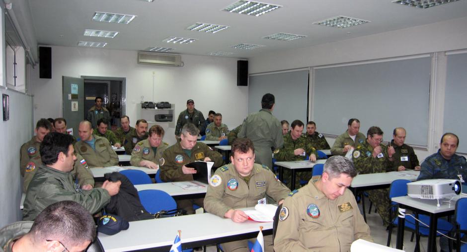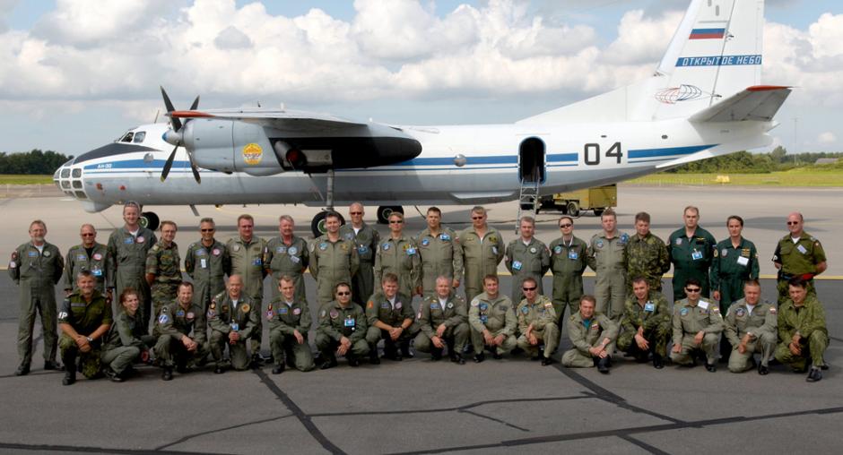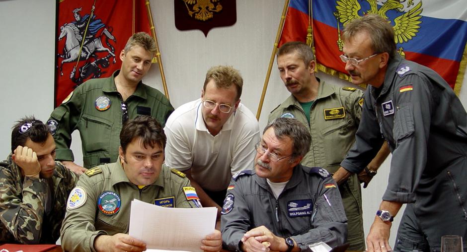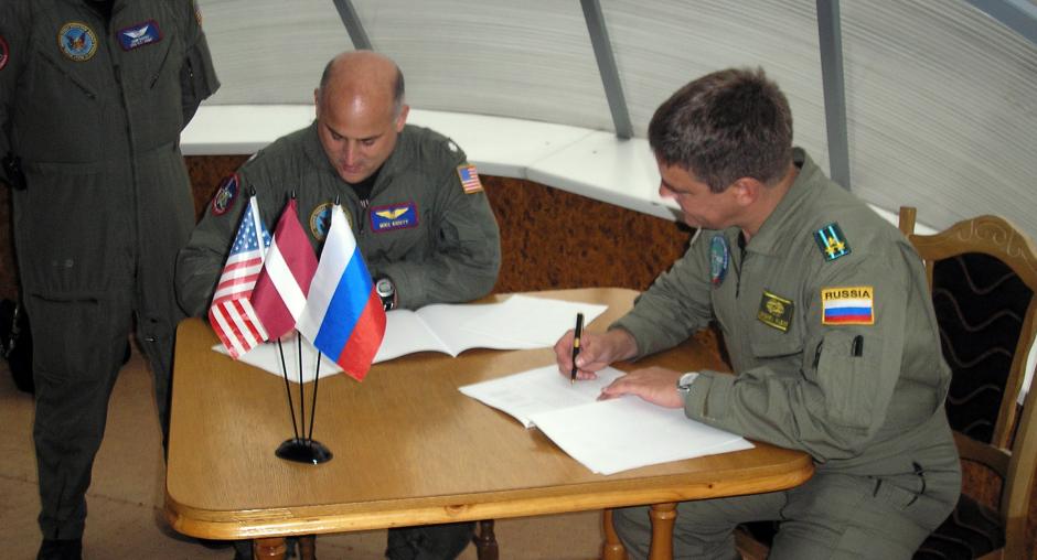 Russian and Danish military personnel responsible for a Russian flight over Denmark, July 2007, under the Open Skies Treaty, which establishes a regime of unarmed aerial observation flights. (OSCE)