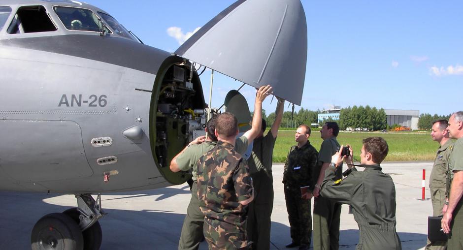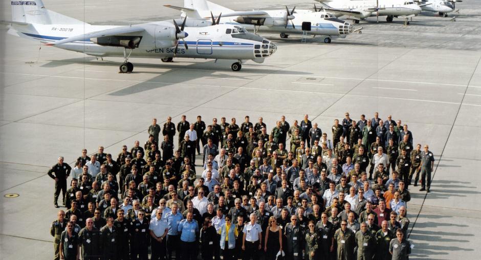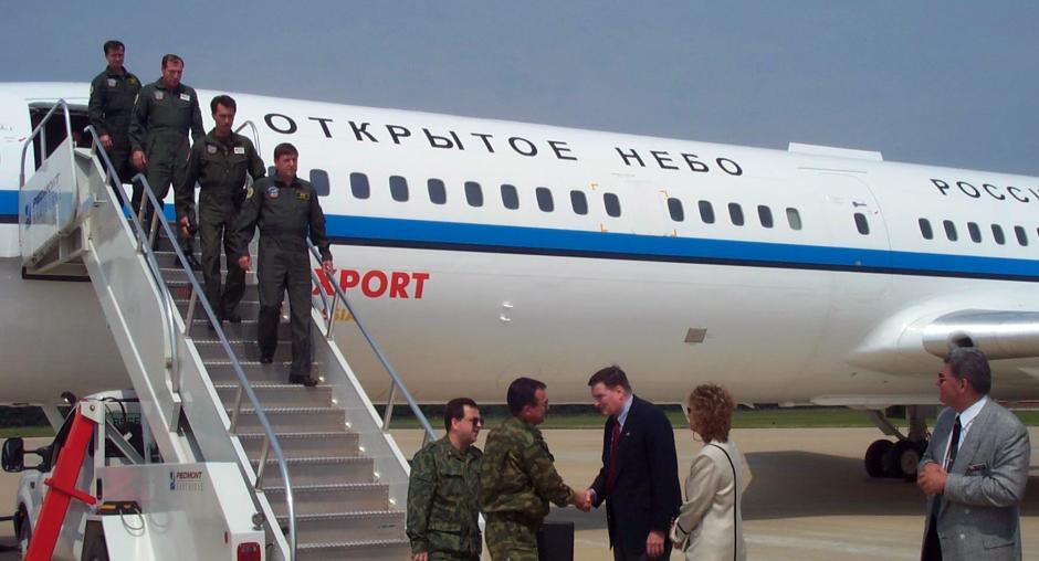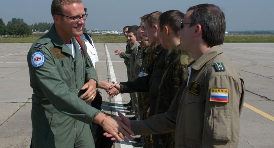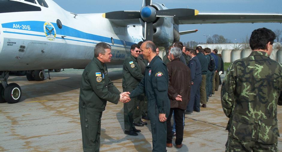 Ukrainian military personnel greeted by their Czech counterparts after a flight over the Czech Republic, April 2003, under the Open Skies Treaty, which establishes a regime of unarmed aerial observation flights over the territory of its 34 signatories. (OSCE)