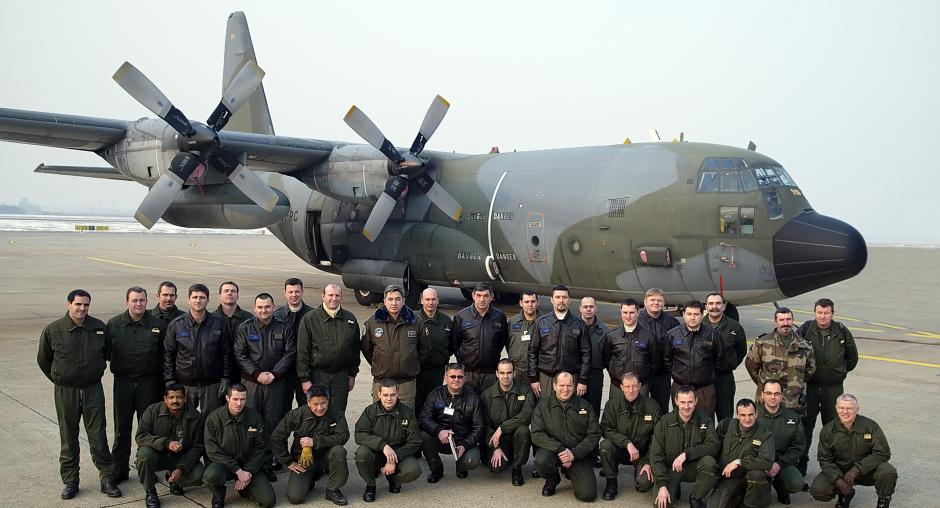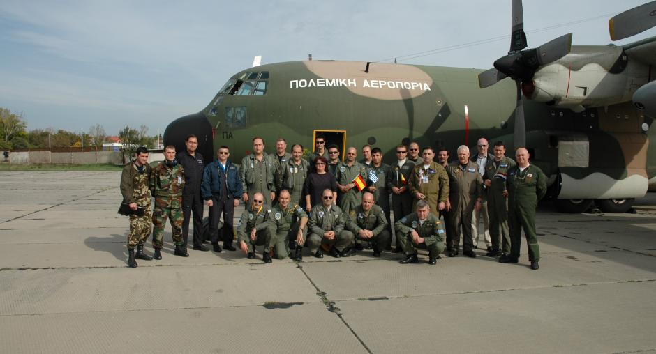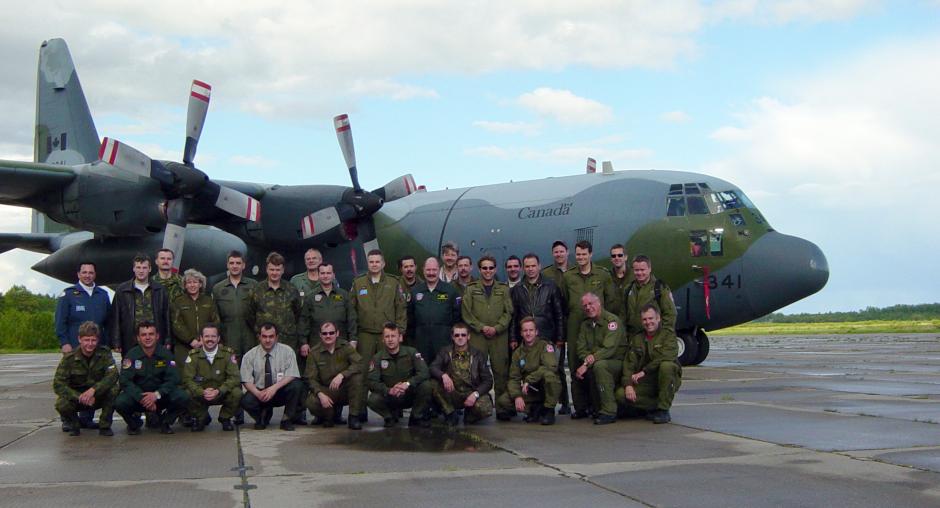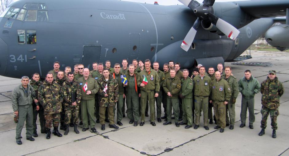 Members of a joint Canadian-Swedish-Italian flight over Georgia under the Open Skies Treaty pose, 30 November 2006, next to a Canadian C-130H aircraft. (OSCE)