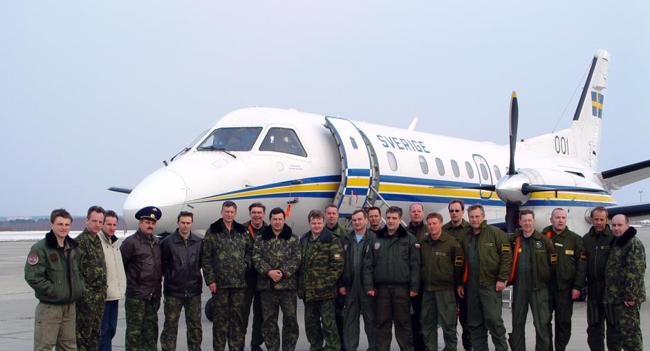 Swedish crew members pose next to their Saab-340B aircraft after an observation flight over the territory of Russia under the Open Skies Treaty, 6 April 2005. (OSCE)