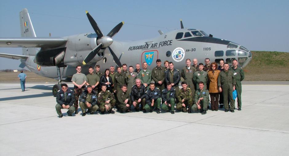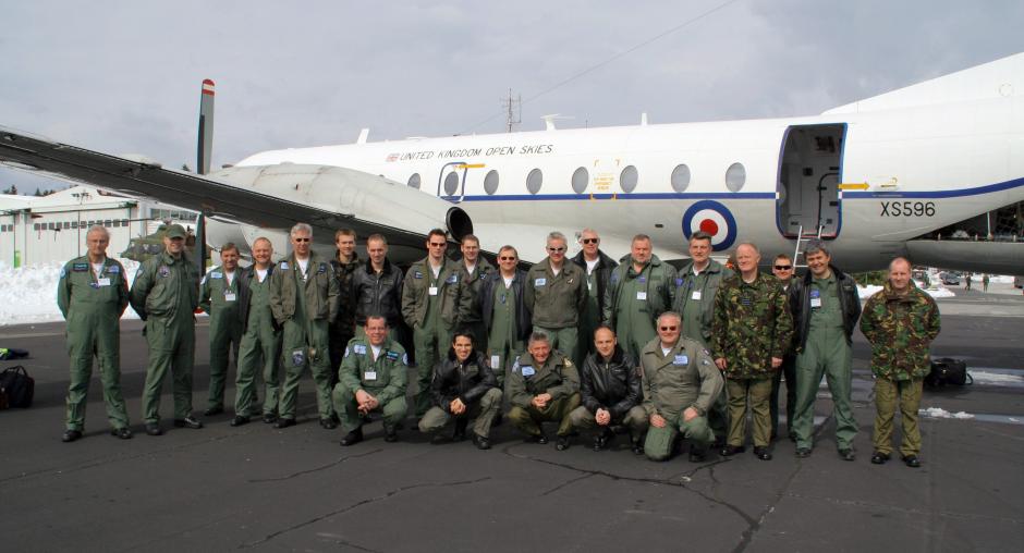 Team members from Slovenia and the United Kingdom pose next to an Andover C Mk1 aircraft during a trial mission by UK over the Republic of Slovenia, at Joze Pucnik Airport, Brnik, March 2007. (OSCE)