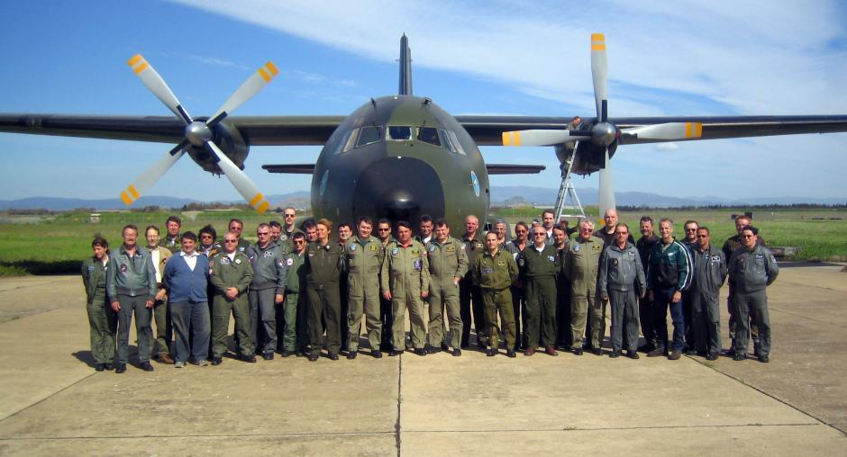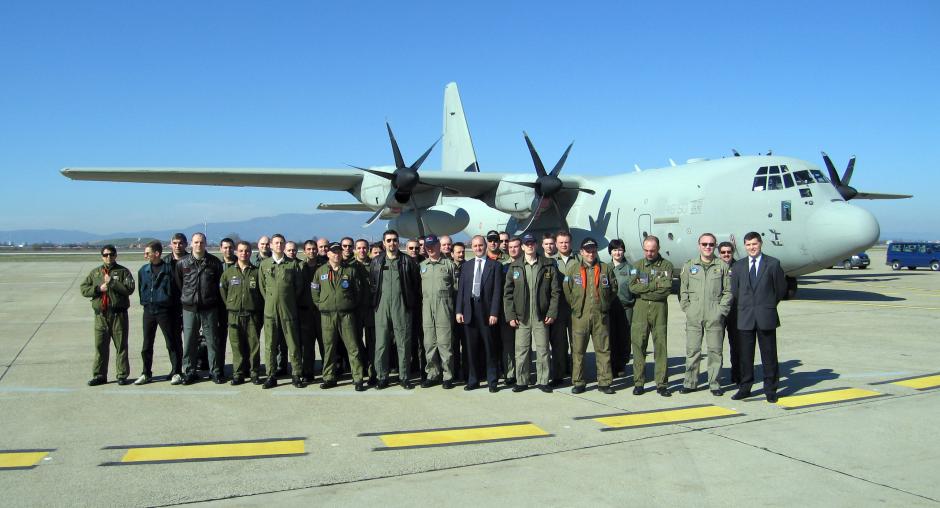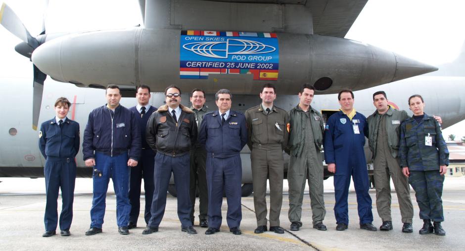 Italian crew members and their Russian counterparts pose next to a C-130H aircraft during flights over Russia, 30 September 2004, under the Open Skies Treaty. (OSCE)