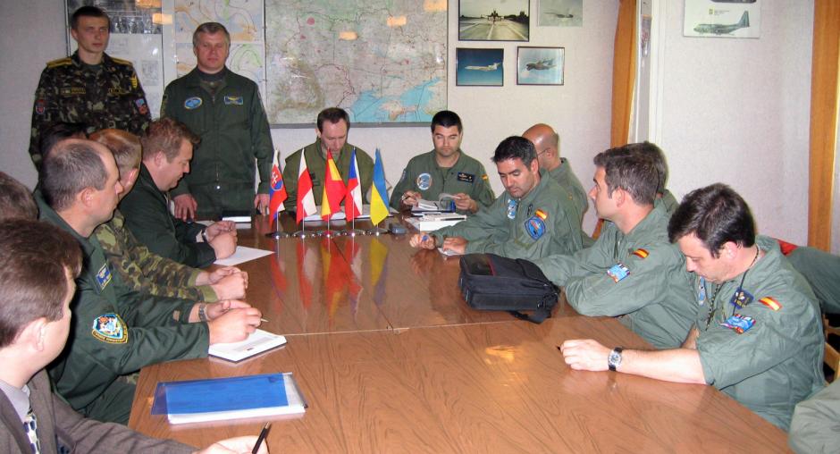 Czech and Spanish military experts discus a flight over Ukraine, May 2004, under the Open Skies Treaty, which establishes a regime of unarmed aerial observation flights over the entire territory of its 34 signatories. (OSCE)