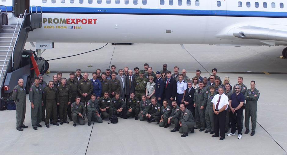 Members of a Russian crew pose on the tarmac next to a Tu-154 aircraft together with their US counterparts during an observation flight over the territory of the United States under the open Skies Treaty, July 2000. (OSCE)