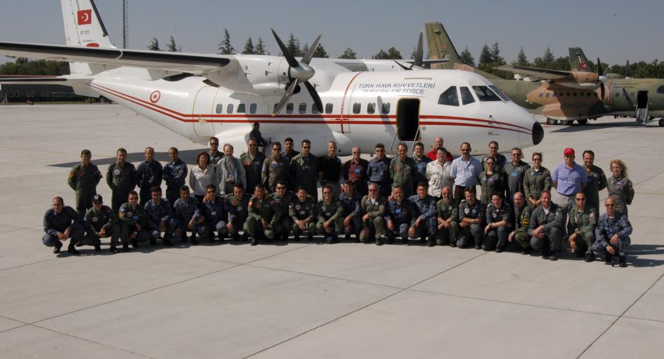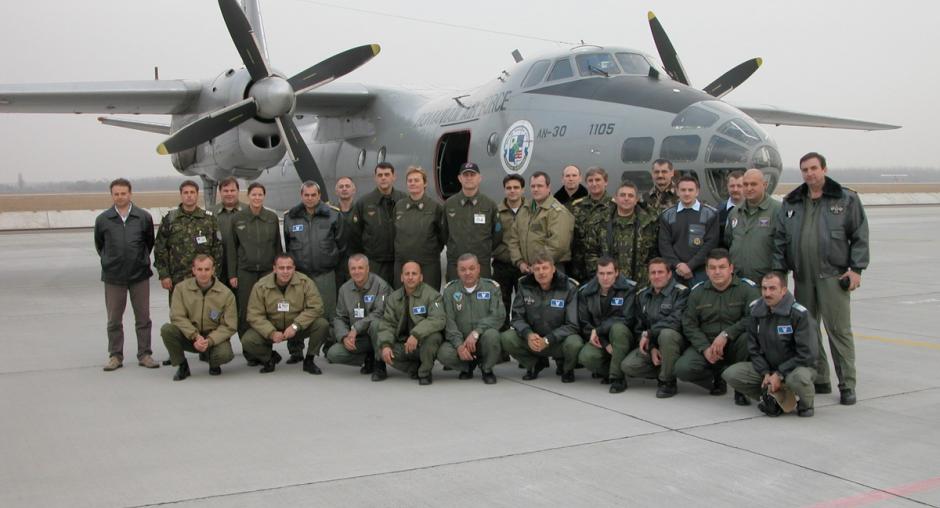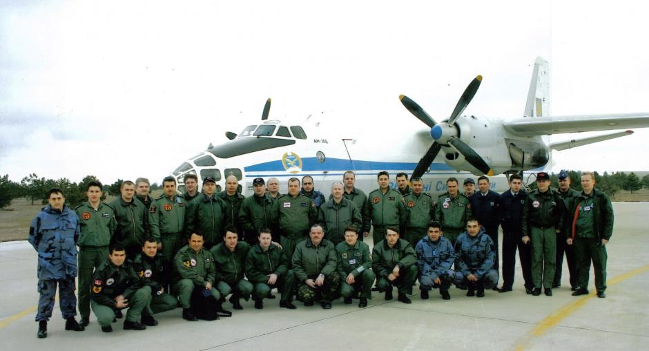 Members of a Ukrainian team that perfomed flights under the Open Skies Treaty over Turkey from 2 to 6 September 2002 pose next to their aircraft. (OSCE)