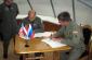 Canadian officer A/Lt.Col. John Preston and Russian officer Col. Alexander Baryshnikov shake hands after signing a document as part of a Russian mission over Canada under the Open Skies Treaty, September 2004. (OSCE)