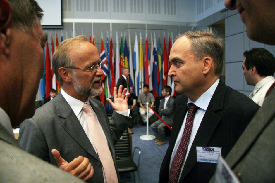 Ambassador Marc Thill (left) of Luxemburg speaks with Anatoly Antonov, the Head of the Russian Delegation to the CFE Treaty Conference, at the Hofburg in Vienna, 12 June 2007.