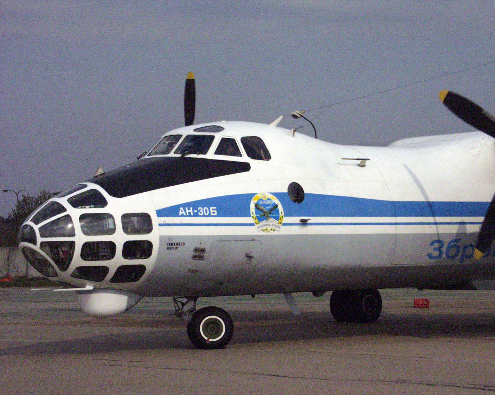 A Ukrainian military Antonov-30 airplane that was used to fly over the Czech Republic, April 2003, under the Open Skies Treaty. The treaty establishes a regime of unarmed aerial observation flights over the entire territory of its 34 signatories.