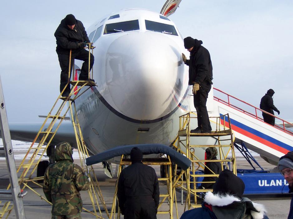 Russian personnel examine a US plane used for a flight over Russia under the Open Skies Treaty, 27 February 2007.
