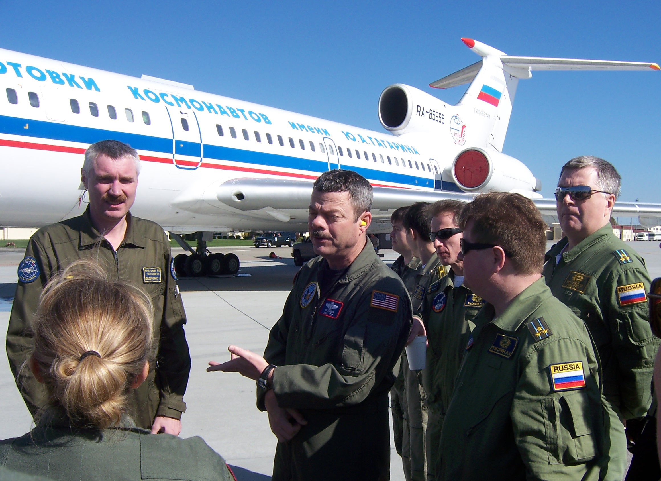 Members of a US Open Skies flight over Russia, 5 August 2005, next to a Russian plane used for flights under the Treaty.