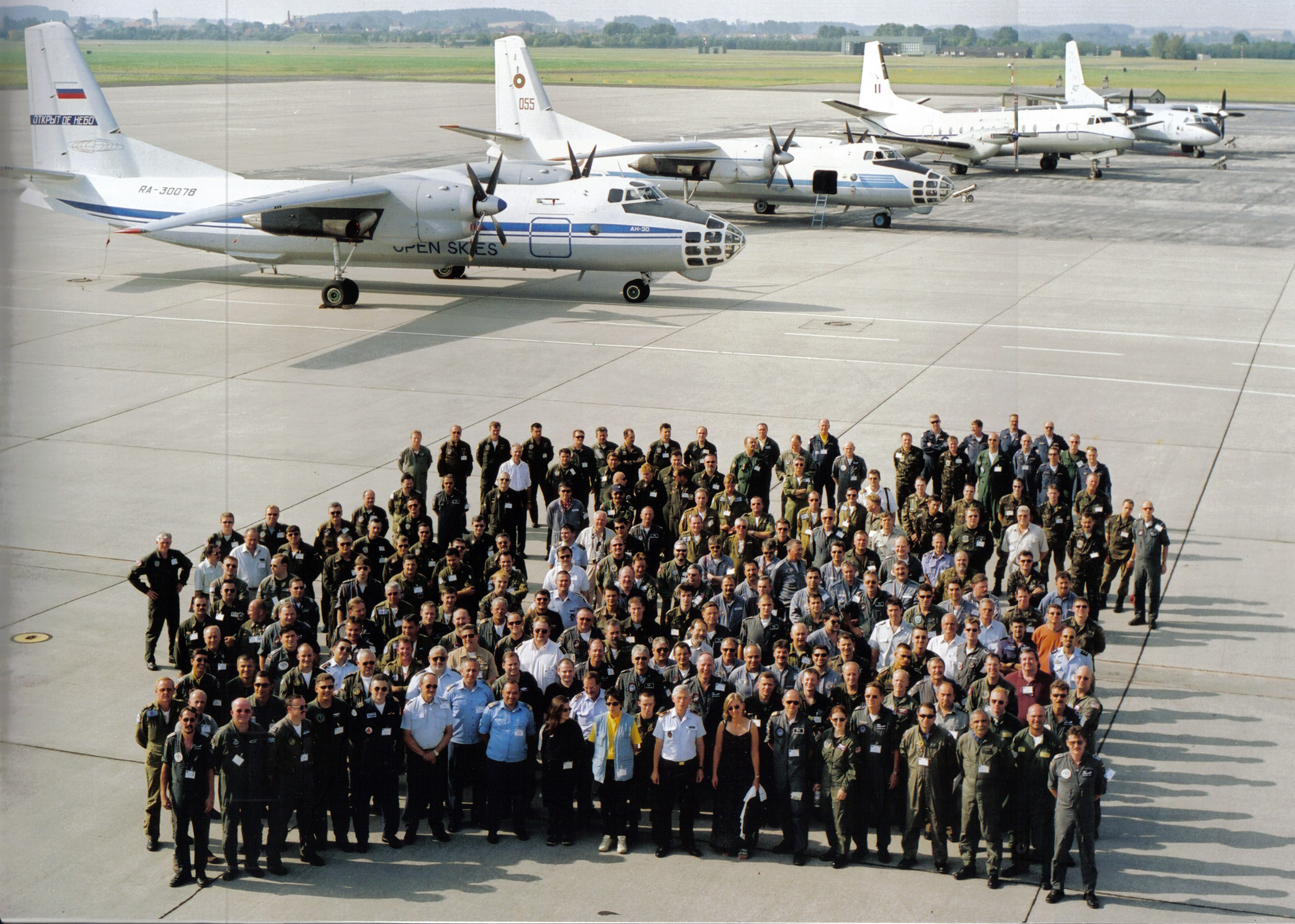 A group photo, including of members of the Ukrainian team participating in flights under the Open Skies Treaty, next to some of the aircraft used under the Treaty.