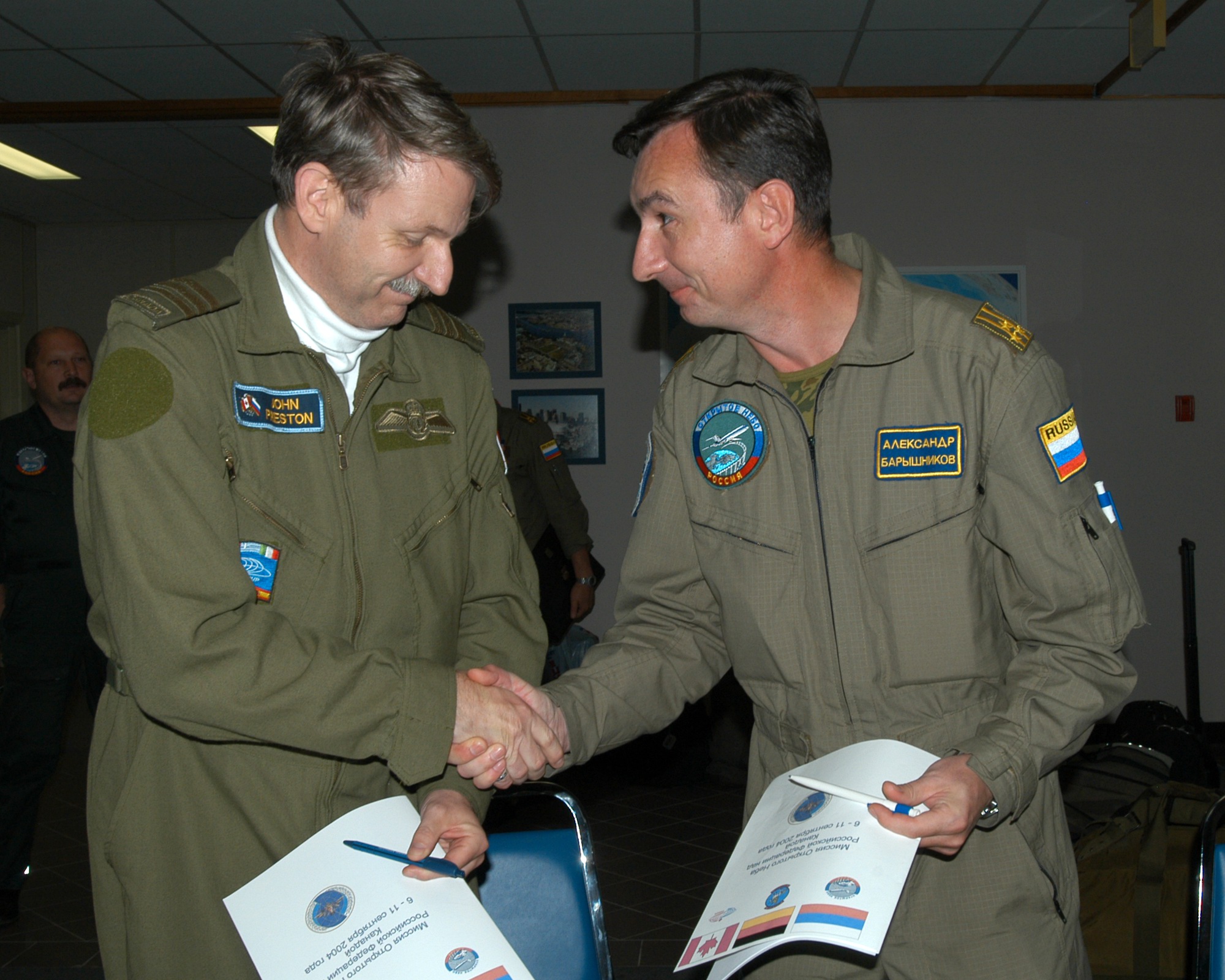 Canadian officer A/Lt.Col. John Preston and Russian officer Col. Alexander Baryshnikov shake hands after signing a document as part of a Russian mission over Canada under the Open Skies Treaty, September 2004.