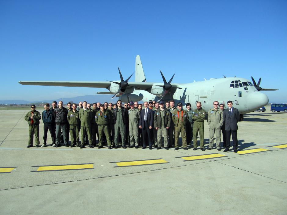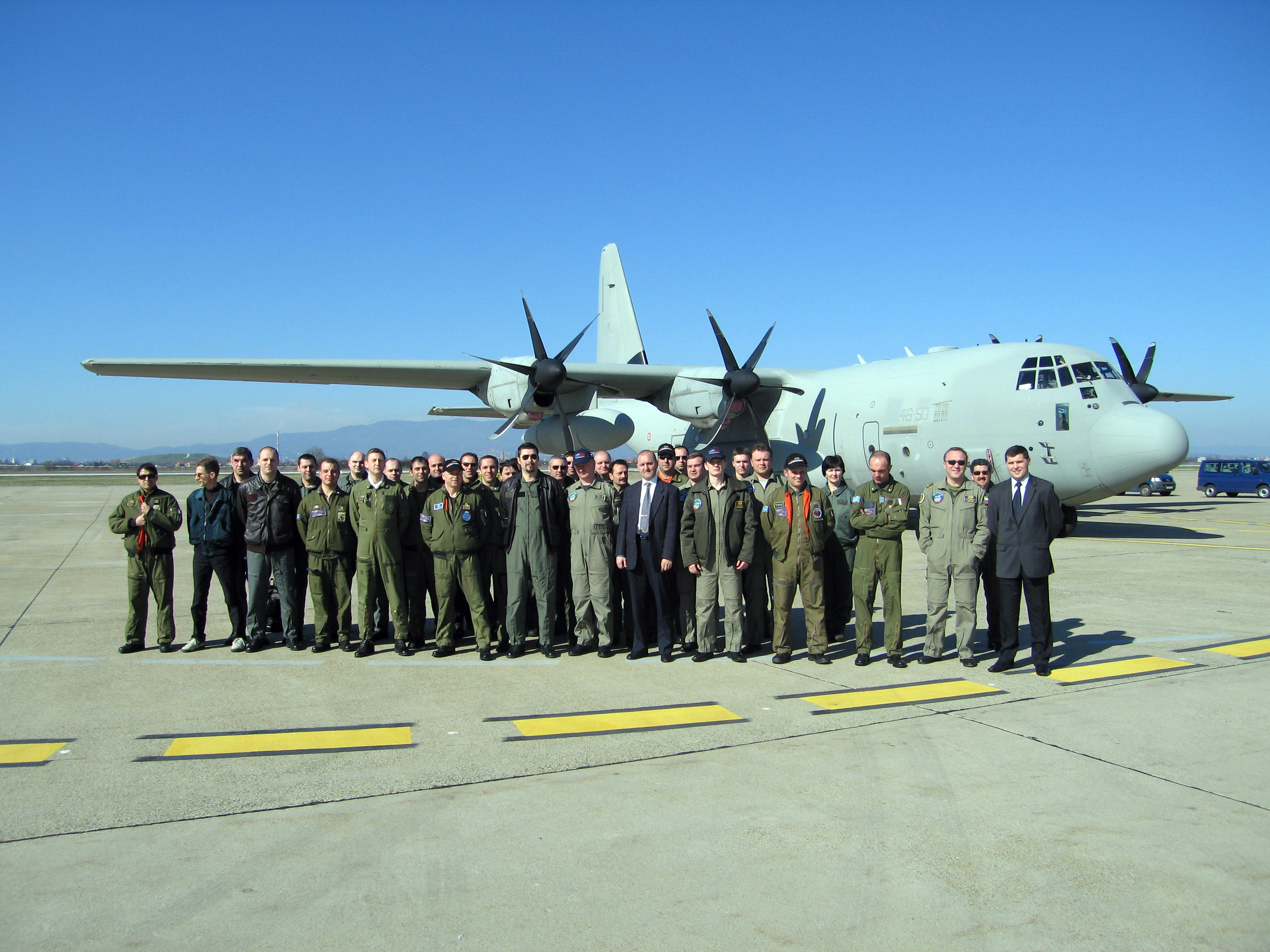 Members of a joint Italian-Russian flight over Croatia under the Open Skies Treaty pose in front of their aircraft, 5 March 2007.
