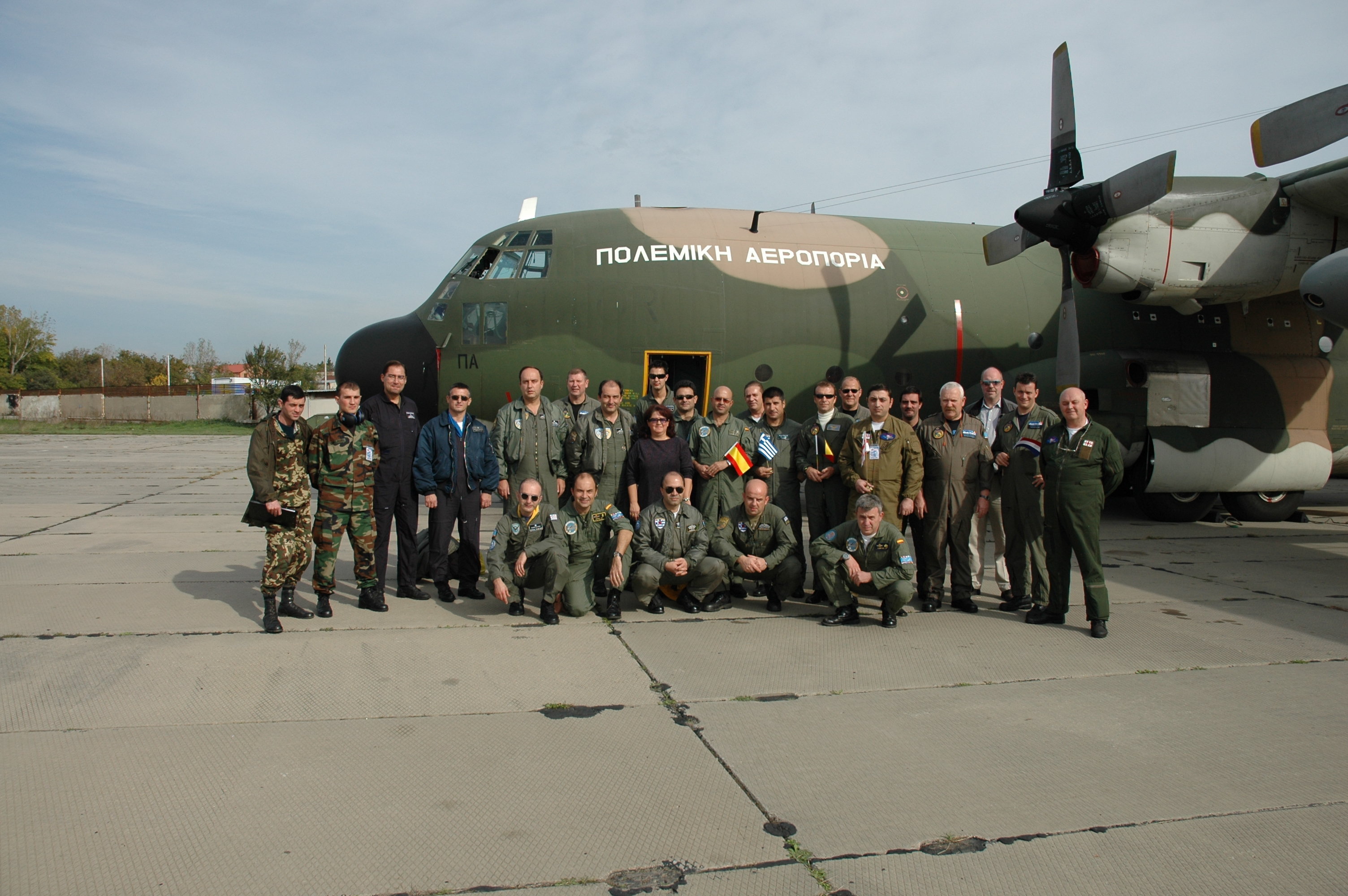 Members of a joint Greek-Benelux-Spanish flight over Georgia, 1 November 2006, under the Open Skies Treaty pose next to their C-130H aircraft.