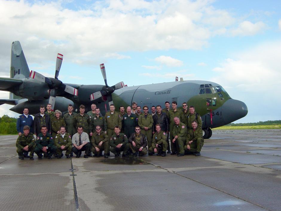 Canadian crew members performing a flight under the Open Skies Treaty over Russia, pose next to their C-130H aircraft, 29 May 2003.