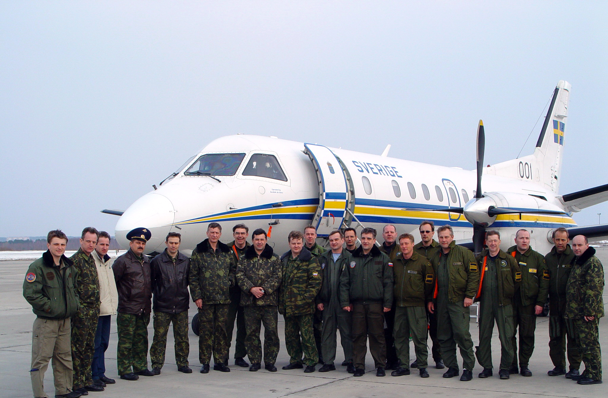 Swedish crew members pose next to their Saab-340B aircraft after an observation flight over the territory of Russia under the Open Skies Treaty, 6 April 2005.