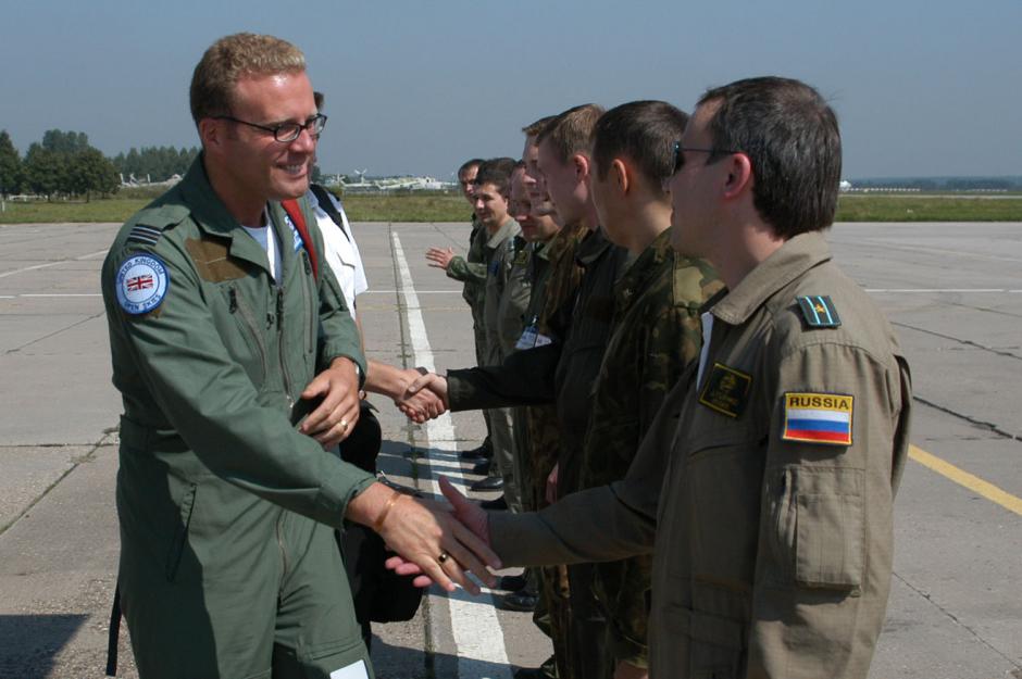 Russian officers (right) greet members of a joint United Kingdom/Croatia observation flight over Russia under the Open Skies Treaty, 14 August 2006.