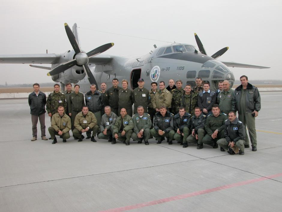 Members of a joint Romania-Hungary flight under the Open Skies Treaty pose in front of an AN-30B aircraft, 20 November 2006.
