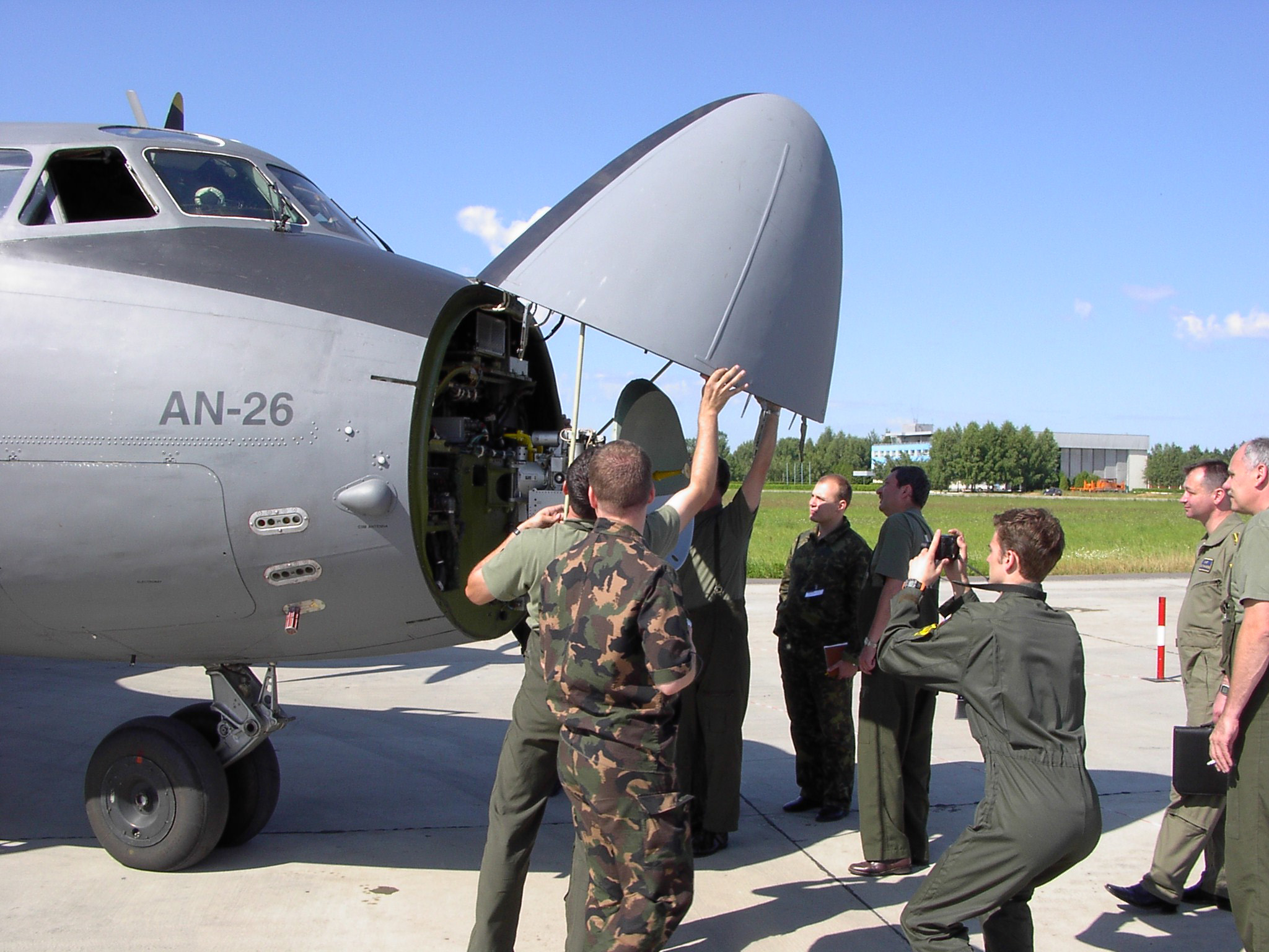 Crew members check the equipment in the nose of an An-26 aircraft used by the Hungarian Air Force to fly observation missions under the Open Skies Treaty, July 2004.