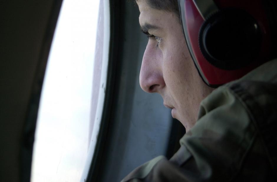 A Georgian border guard watches through the window as his helicopter approaches Shatili station.