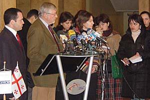 Georgian CEC Chair, Zurab Chiaberashvili (left), and Head of OSCE Mission to Georgia, Roy Reeve, brief journalists after signing agreements of OSCE support for voter information and voter marking for Georgia's parliamentary elections.