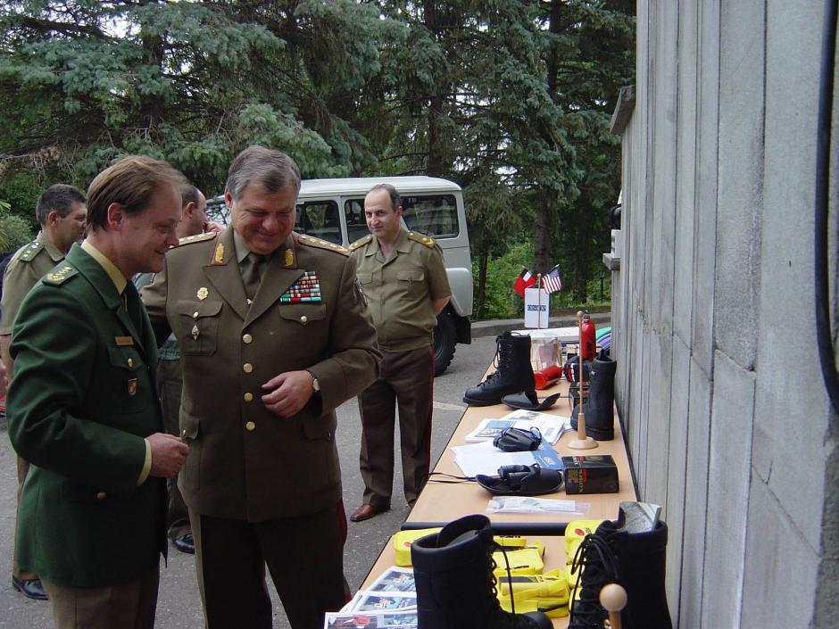 The Head of the Georgian border guards, General Valeri Chkheidze (right), received the military equipment for the border monitors at the OSCE Mission, Tbilisi, 29 July 2003.