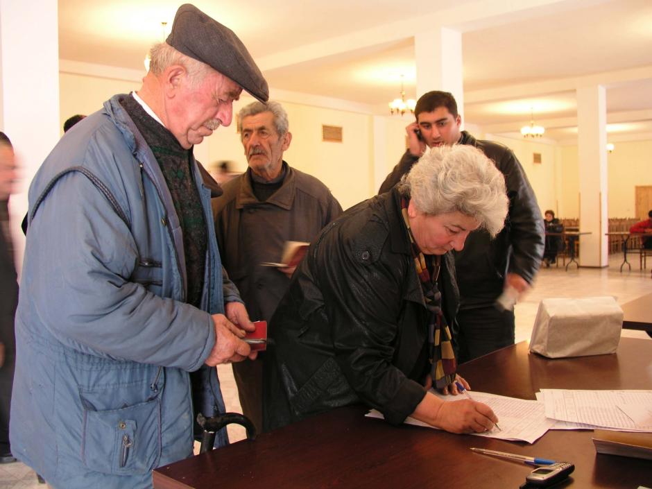 Inside the polling station, local residents complete the steps necessary to vote, Bolnisi, Georgia, 2 November 2003.