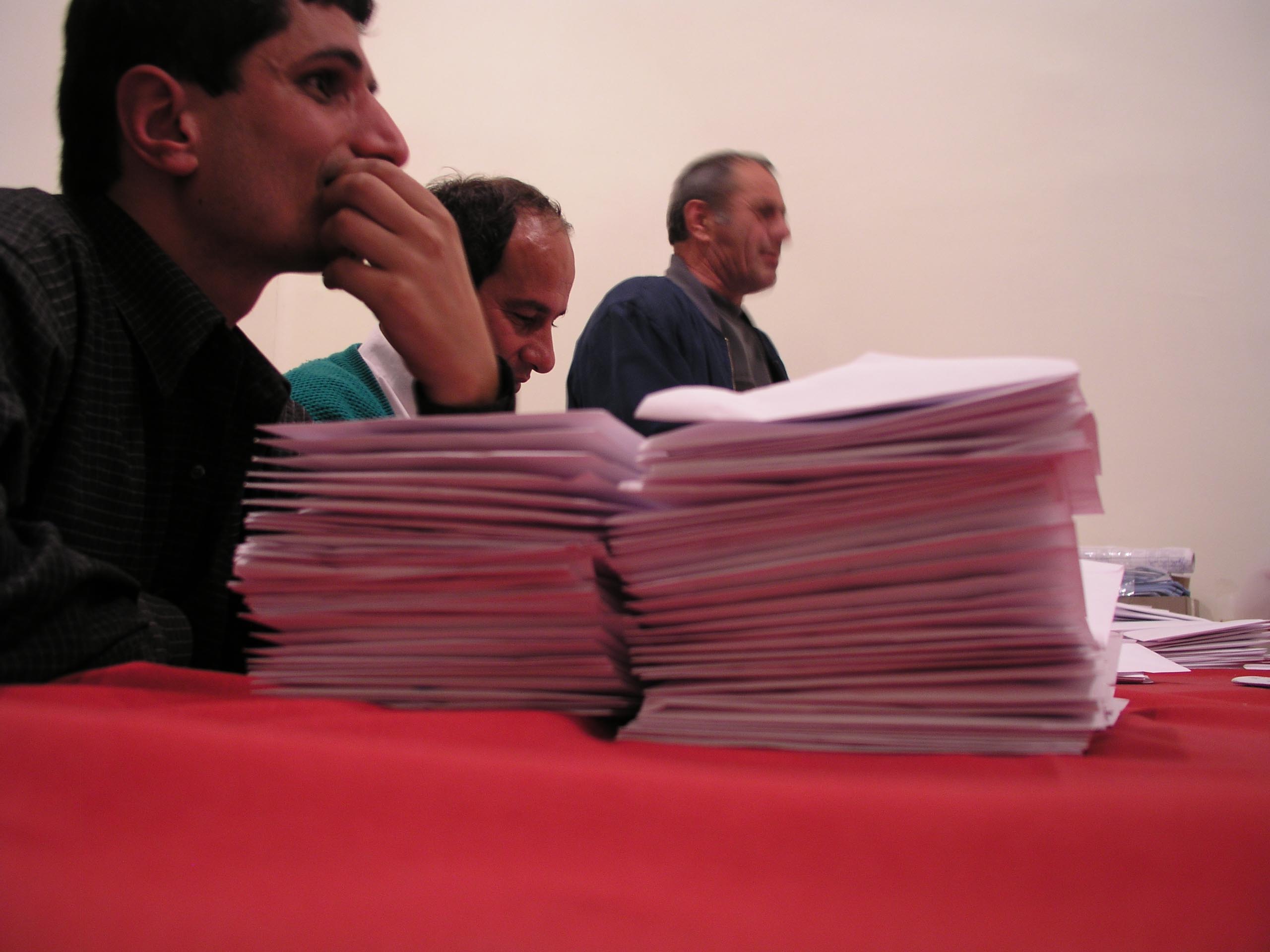 At 11:43 PM, Election station officials organize ballots into piles, Bolnisi, Georgia, 2 November 2003.