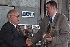 Delta Director General Givi Lekishvili (left) presenting an anti-aircraft artillery shell casing to OSCE Secretary General Jan Kubis at the Georgian Ammunition Recycling and Destruction Center, Dedoplistskaro, 8 July 2003.