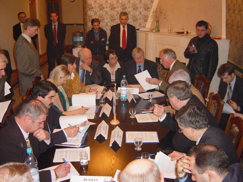 Head of the OSCE Mission to Georgia, Ambassador Roy Reeve (top of table, second from right), during the final editing of the protocol on the implementation of the European Commission funded grant, Tskhinvali, 31 January 2004.