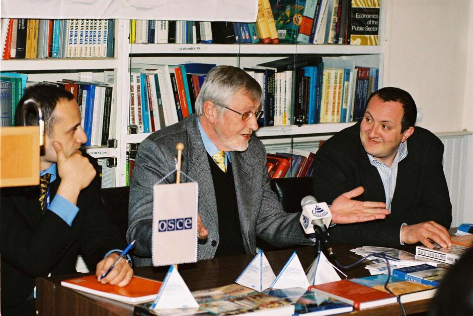 Head of the OSCE Mission to Georgia, Ambassador Roy Reeve (left), handed over manuals on good governance to the Georgian Institute of Public Affairs (GIPA), March 2005.