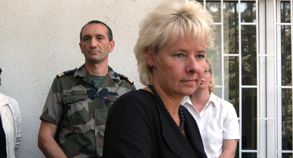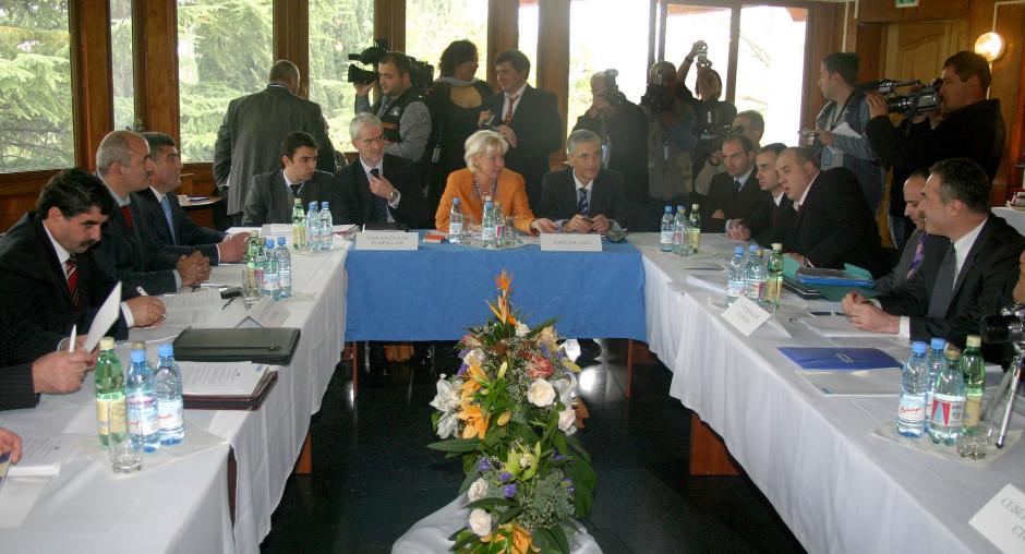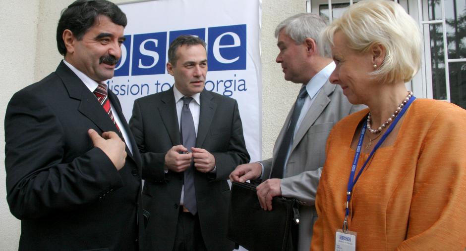 Ambassador Terhi Hakala (right), Head of the OSCE Mission to Georgia, welcomes representatives of the Georgian, South Ossetian, North Ossetian and Russian sides to a Joint Control Commission meeting, Tbilisi, 23 October 2007. (OSCE/David Khizanishvili)
