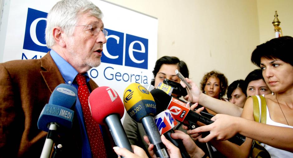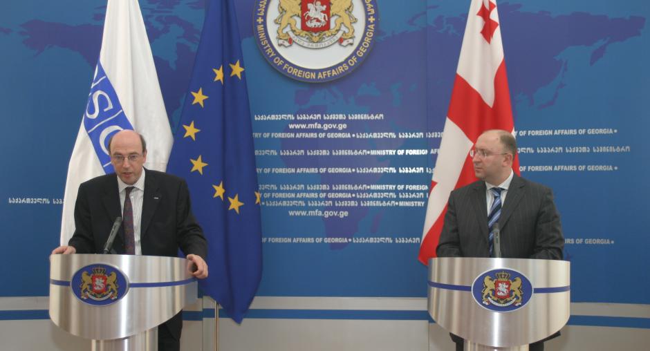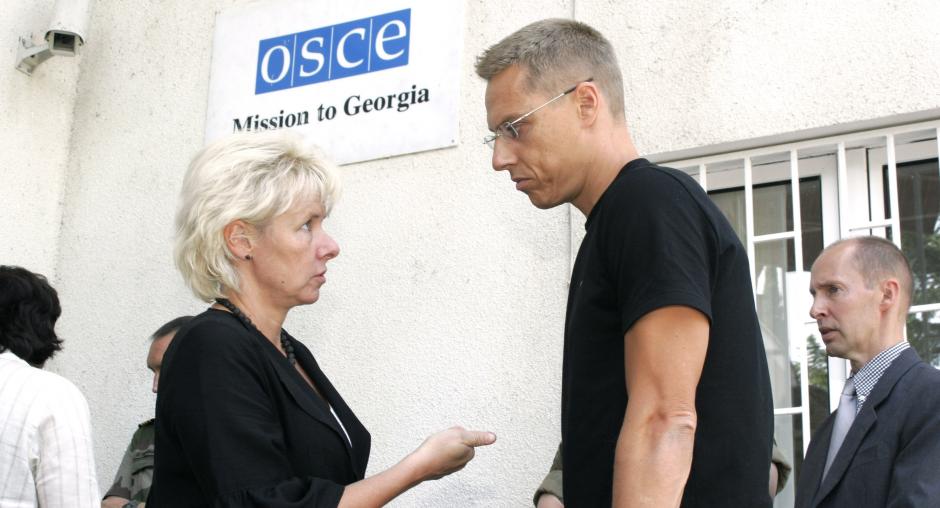 OSCE Chairman Alexander Stubb with Ambassador Terhi Hakala (left), the Head of the OSCE Mission to Georgia, in Tbilisi, 22 August 2008. (OSCE/David Khizanishvili)