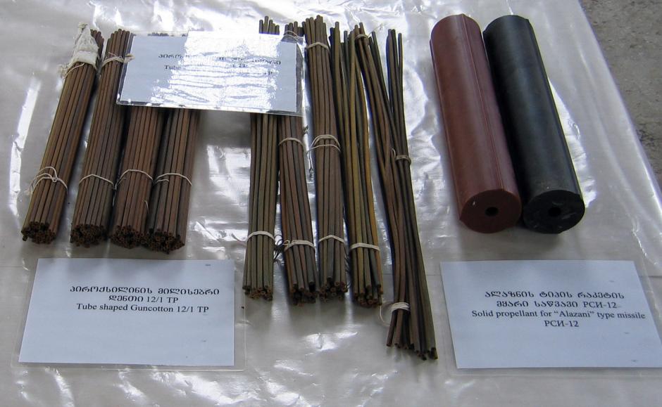 Samples of ballistic propellant displayed at the Dedoplitskaro military base, in Georgia, 12 March 2007.