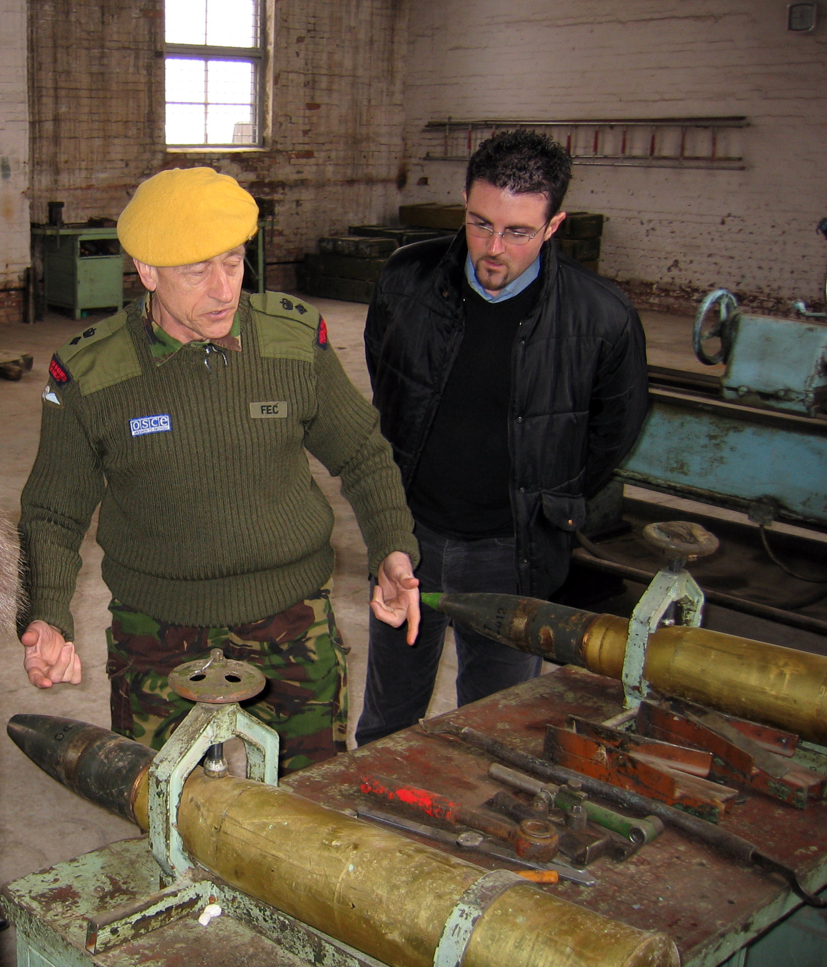 OSCE military expert Zbigniew Fec (left) explains to a visitor the manual procedure of dismantling old shells, at Dedoplitskaro military base, in Georgia, 1 March 2007. The process is part of an OSCE Mission to Georgia programme.